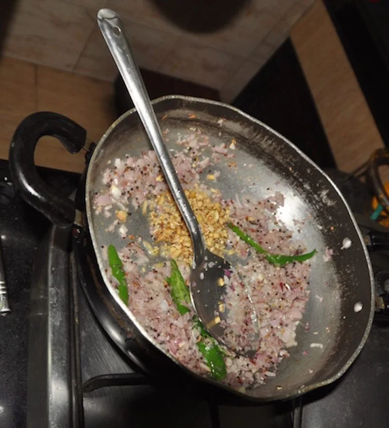 Saute for 5 min, then add garlic, ginger, green chilies and curry leaves. Saute for another 2 min.