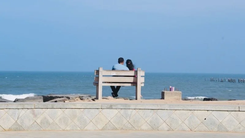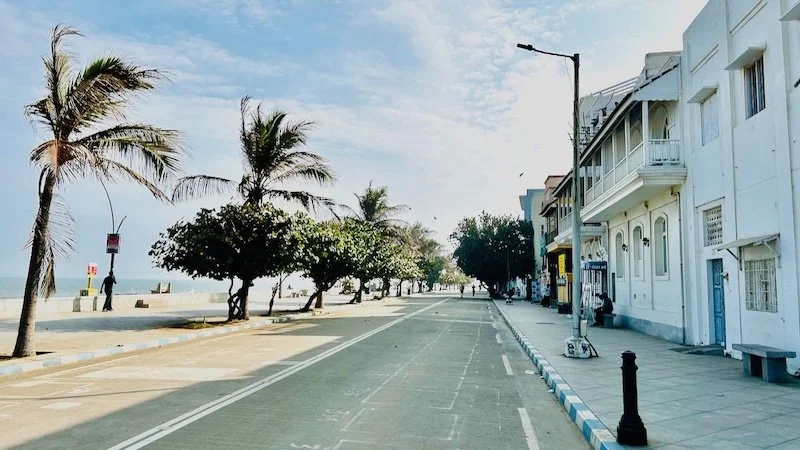 As we strolled along the beach on a bright sunny day, it would have been easy to convince ourselves that we were in a French seaside town. The wide seafront promenade, the swaying palm trees, the white painted balconies overlooking the road all reminded us of a Mediterranean resort. In reality we were on the other side of the world, in the city of Pondicherry in South India.