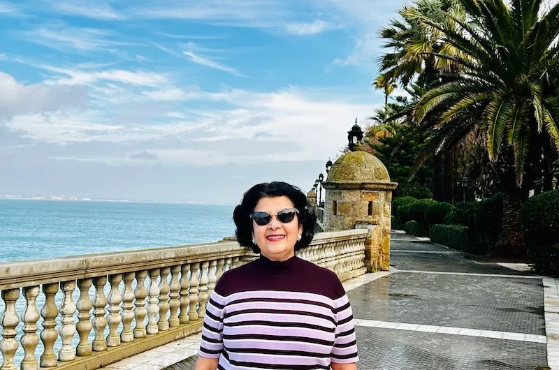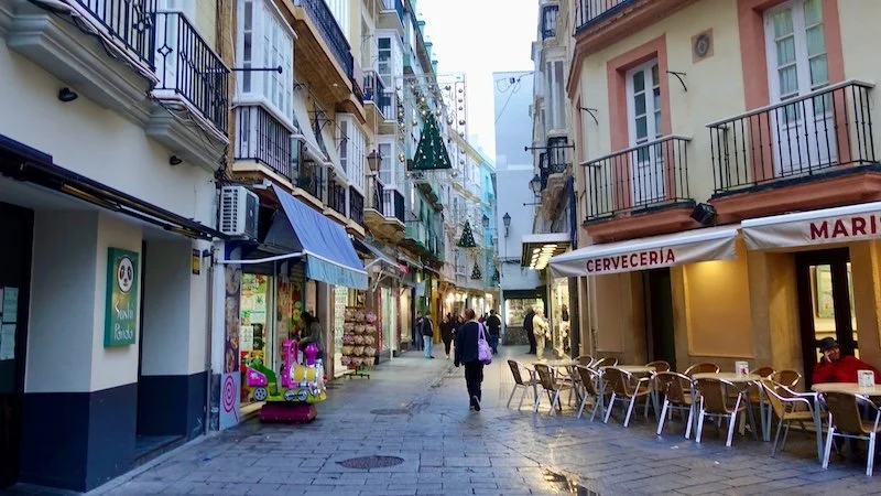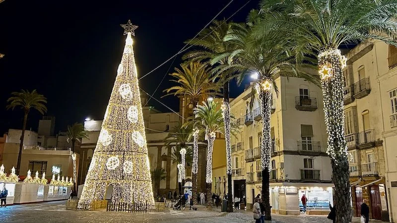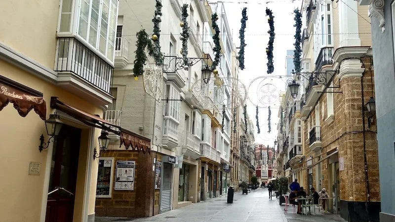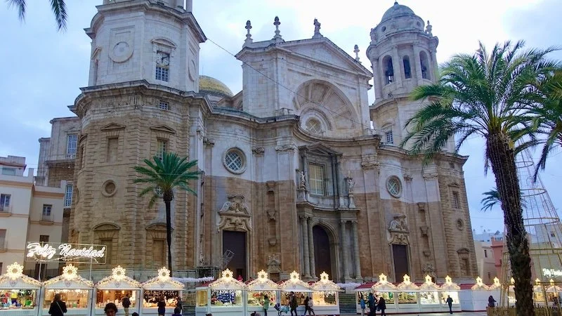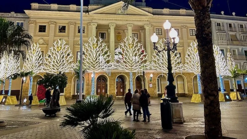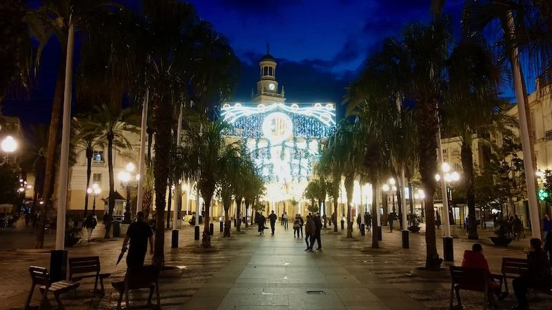 Cádiz was magical when we visited the week before Christmas. The old town consists of many broad plazas bordered by great churches and historical mansions. As we strolled through the maze of narrow lanes that connect the open squares, we walked past buildings and trees that were brilliantly illuminated, making it look like an enchanted wonderland. The palm trees wrapped in sparkling lights reminded us that we were on the shores of the Mediterranean, for the city has always been one of the most important ports in Europe.
