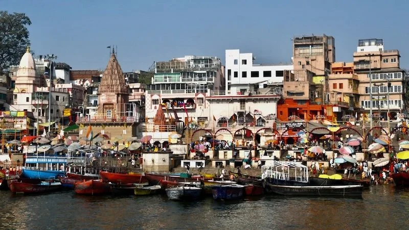 The city stretches out along the riverfront which consists of an unbroken series of ghats, steps that lead down to the river so that bathers can descend into the water. Every ghat has its own name, history and legend. The Dashashwamedh Ghat is said to be the place where the god Brahma performed a sacrifice to welcome Shiva to Varanasi, making it one of the most important ghats. The Manikarnika Ghat is located where Shiva dropped his earring (manikarnika in Sanskrit) while bathing, and being cremated here is sufficient to be assured of salvation. Funeral pyres burn here day and night.