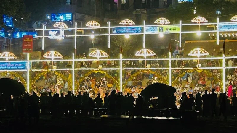 One of the most popular sights in Varanasi is the evening Ganga Aarti, a prayer ceremony in which priests chant sacred verses and blow conch shells while waving, in perfectly synchronized motions, large, multi-tiered lamps with blazing flames. Huge crowds assemble each evening to view the rites, either sitting on the steps of the ghats or renting boats to watch from the river. The roughly hour-long service is a mesmerizing spectacle.