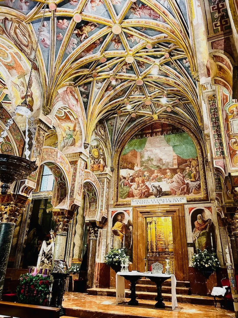 Córdoba has many beautiful buildings well worth visiting, but the one we fell in love with is the Mezquita-Cathedral, a mosque converted into a cathedral. The mosque was built by Arabs on the site of a Visigothic church in the eighth century and is a wonder to behold, with seemingly endless rows of pillars topped by striped arches and a towering minaret overhead. When Christians reconquered Córdoba they found the building so beautiful that they preserved it, but added a cathedral in its centre and converted the minaret into a bell-tower, and so it stands today.