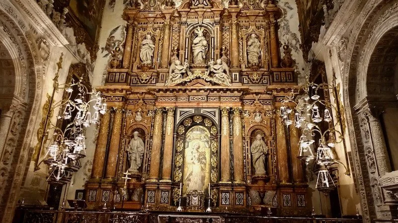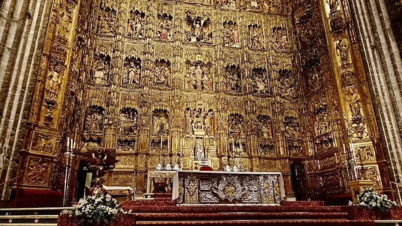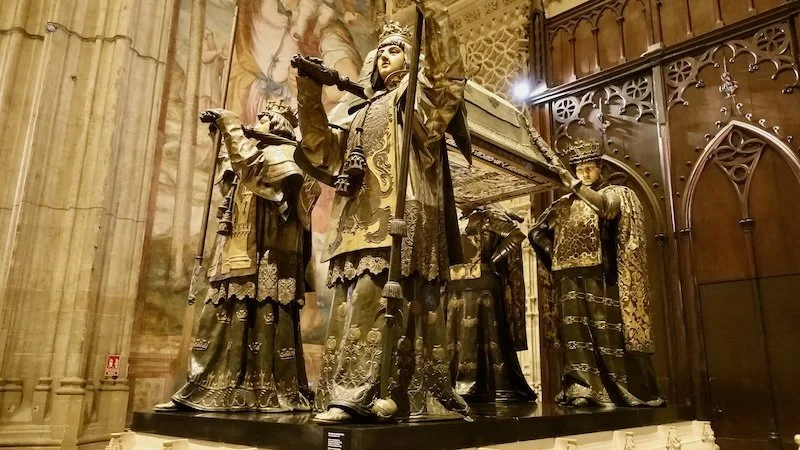 The interior of Seville’s cathedral is a spectacular display of gold, a reminder of the wealth that flooded into Spain from its American colonies. Seville was the main port from which ships sailed for the New World, and to which they brought back its riches. Christopher Columbus lies buried in the cathedral, in a spectacular tomb in which crowned figures carry his sarcophagus.