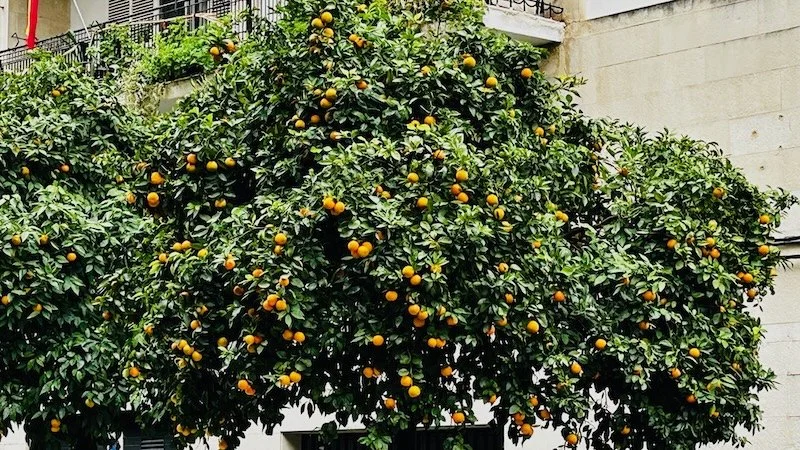 The scent of oranges immediately brings back memories of Seville for us, for it was the first thing that we noticed there. Every street in the city is lined with orange trees and ripe fruit constantly drops from them, perfuming the air. The trees are a memorial to the Moorish rulers of Seville who first planted them more than a thousand years ago, and who rejoiced in the flavour and scent of oranges.