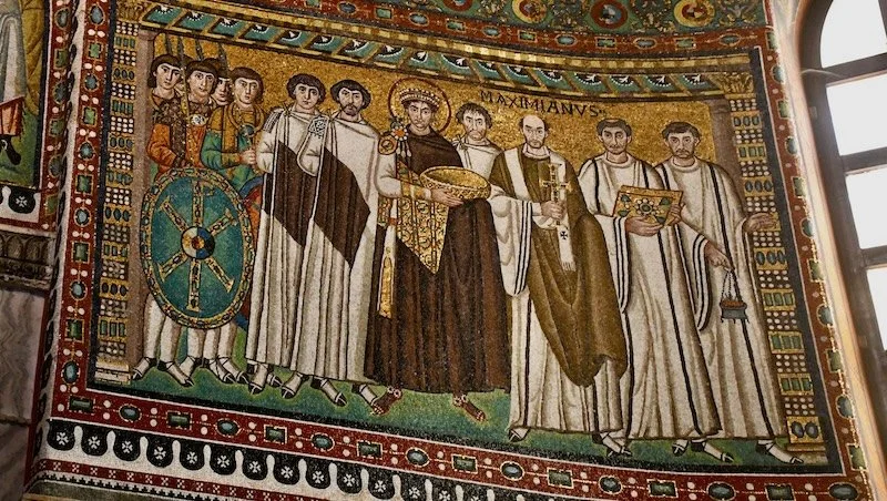 On one side of the altar we saw a portrait of the sixth century Emperor Justinian, ruler of the Byzantine empire with its capital in Constantinople. Ravenna remained part of Byzantium even as the rest of the western Roman Empire collapsed, overrun by Germanic tribes sweeping down from the north. The portrait of Justinian, surrounded by churchmen and soldiers, symbolizes the protection he offered the city from the chaos engulfing the rest of Italy.