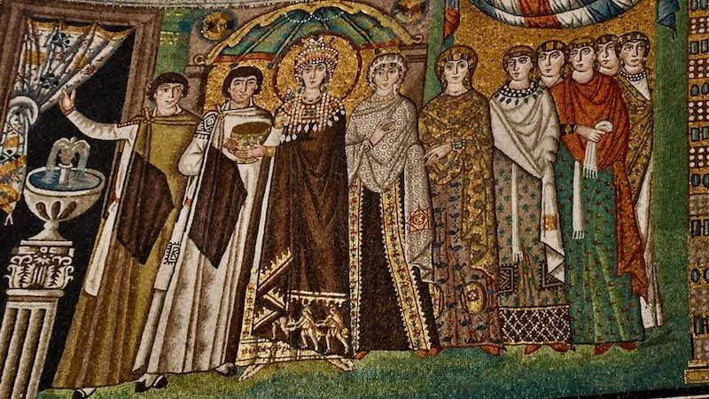 On the other side of the altar was a mosaic of the Empress Theodora, wife of Justinian, appearing equally regal. The Byzantine empire reached its zenith during their reign, with a great flowering of art and architecture. They built many magnificent churches besides San Vitale, including the greatest of all, the Hagia Sophia in Constantinople. The Basilica of Sant'Apollinare Nuovo, built in Ravenna at about the same time as San Vitale, is another glorious building with its interior completely covered with mosaics depicting biblical stories.