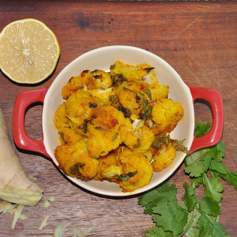 Cauliflower and potatoes cooked with sauteed onions and spices