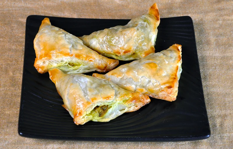 Puff pastry triangles stuffed with spicy potatoes and peas