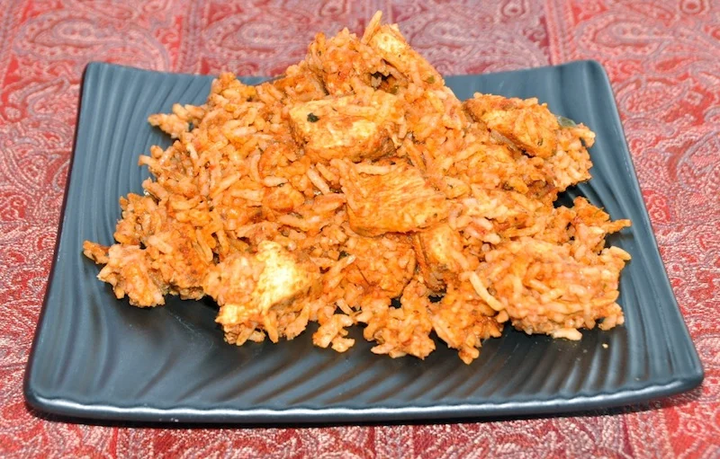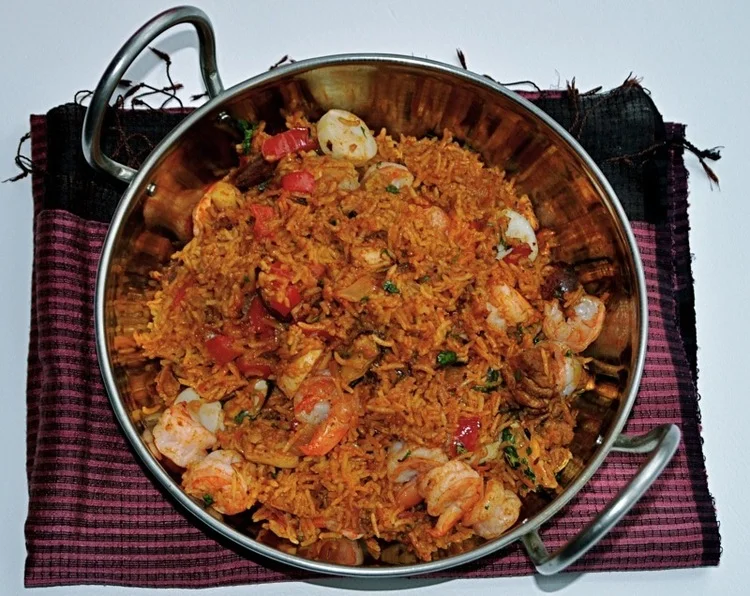 Paella made Indian style with seafood, sausage, spices, herbs and rice