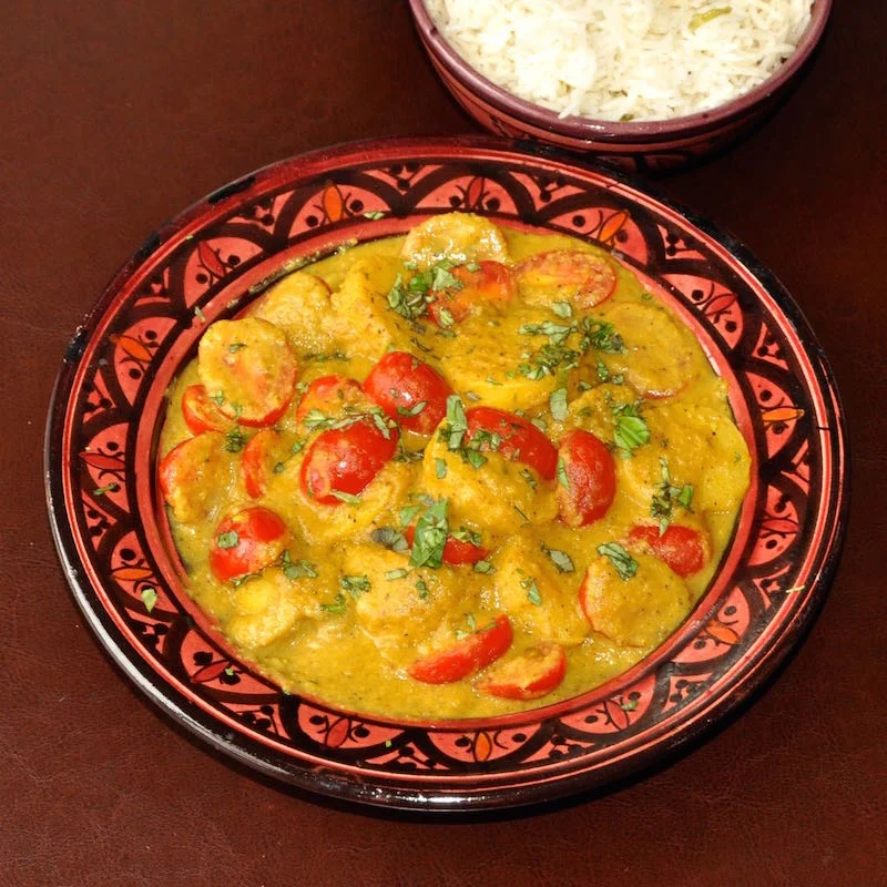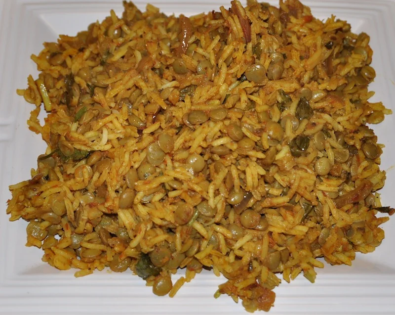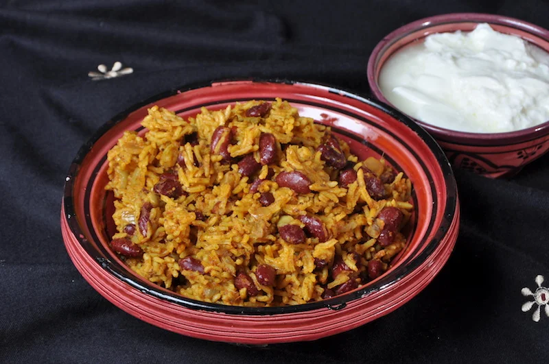 kidney beans simmered with salsa, coconut milk and spices, cooked with rice