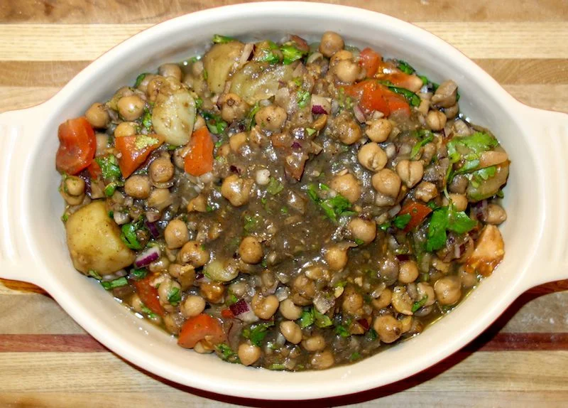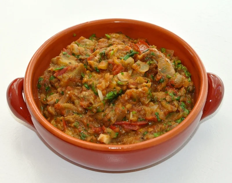 Roasted eggplant sauteed with onions, tomatoes and spices